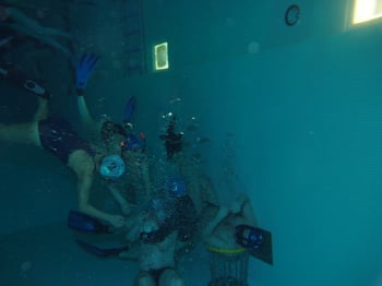 Danach spielen wir hier noch 30 Minuten UW-Rugby. So kommt unser Kreislauf auf Touren, und es werden ein paar Kalorien verbrannt. Ausser ein paar kleinen Kratzern bleiben nur zufriedene Gesichter nach dem Spiel zurück, denn bei uns gibt es keine Sieger oder Loser. Wir zählen keine Tore und schauen, dass beide Teams ungefähr gleich stark sind.